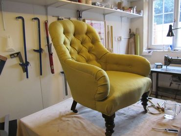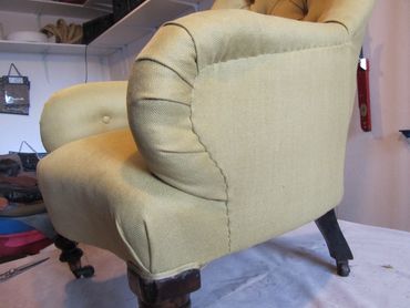 This chair has been completely reupholstered from the original bare frame using traditional upholstery methods including hand tied coil springs with stitched roll edges and to finish the legs were French Polished. The pictures below show various stages of completion.